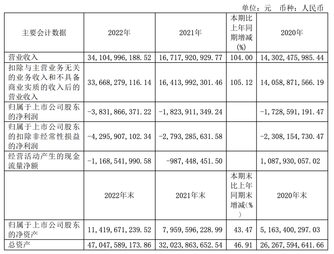 4月28日晚间,赛力斯发布2022年财报。数据显示,报告期内赛力斯营业收入341.05亿元,同比增长104.00%,其中新能源汽车收入249.34亿元,同比增长482.8%,占公司营业收入的73.1%。净亏损38.22亿元,同期净亏损18.24亿元。扣非净亏损42.96亿元,同期净亏损27.93亿元。