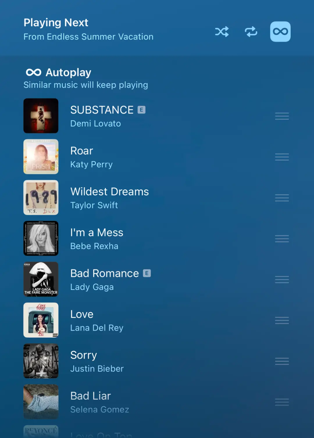 包括 Apple Music,早期极力宣传自己的歌单都由真人编辑,而非算法生成。但在 2021 年,苹果也推出了“自动播放”功能。这个功能与 Spotify 的算法系统类似,会在用户播放一张专辑、歌单后,继续自动播放算法推荐的歌,无限续播下去。