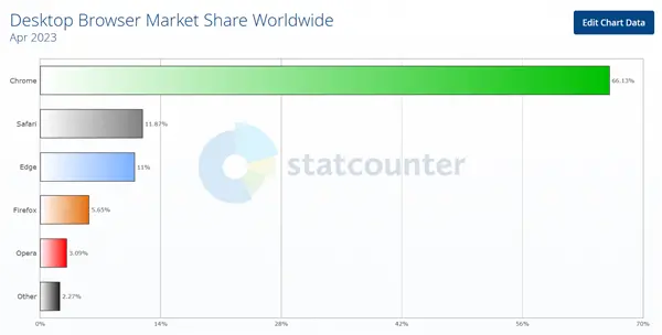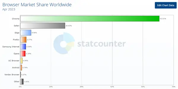 日前,数据研究机构Statcounter公布了2023年4月全球浏览器使用数据。首先来看全平台份额,在4月全球大战中,GoogleChrome稳坐榜单第一,以63.51%的全球市场份额遥遥领先,不过,相比上月64.76%的份额下降1.25%,随后是苹果Safari,以20.43%的份额排名第二,较上月提高0.91%,微软Edge位列第三,占比4.96%。