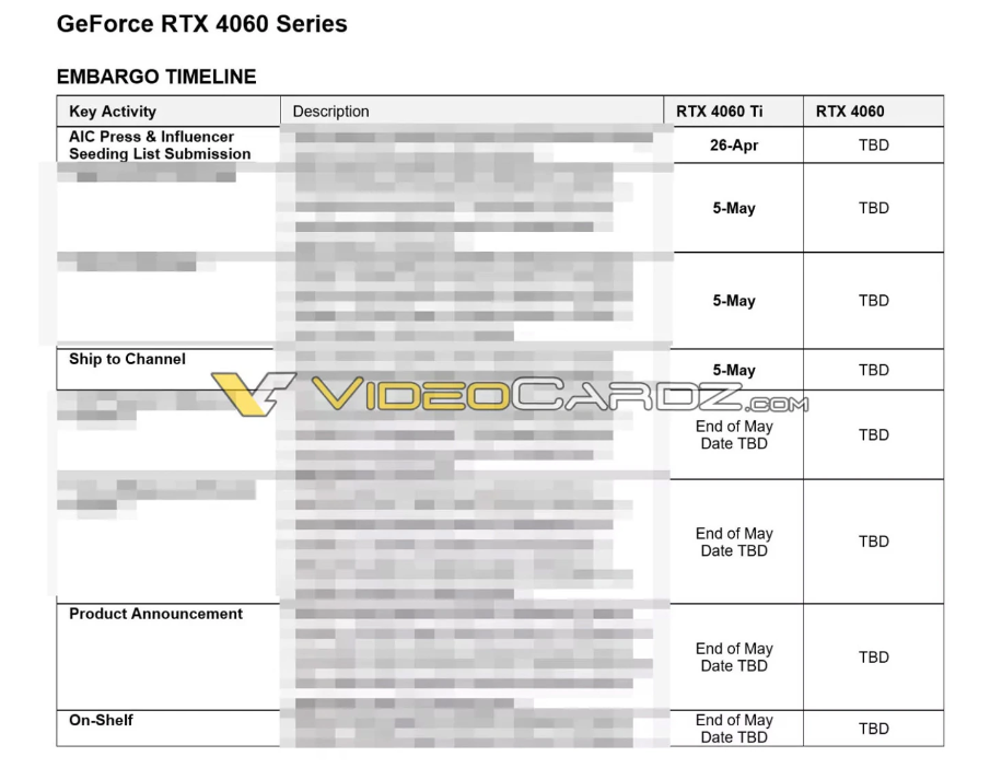 根据Videocardz放出的NDA简报透露,NVIDIA新一批产品的解禁时间表已经被发给各个AIC合作伙伴。这些产品中,最为重要,也最受关注的,自然是新一代的RTX 4060 Ti显卡。