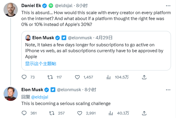 今天凌晨,马斯克公开回复Daniel Ek,称如果30%的高额抽成得到扩展,那么“将演变为一个严重的规模性挑战”。