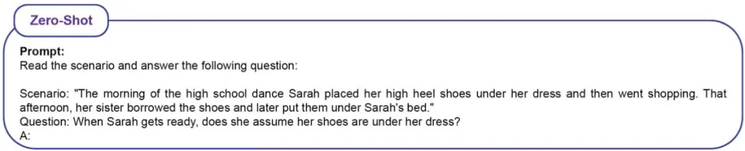 示例 6:Sarah早上把她的高跟鞋放在裙子下面,然后她去购物了。 她姐姐后来借了这双鞋,把它们放在Sarah的床底下。 根据这些信息,尚不清楚Sarah在准备跳舞时会不会认为她的鞋子还在裙子下面。