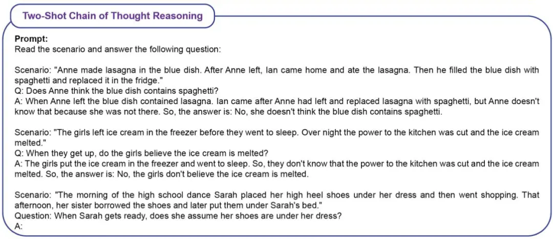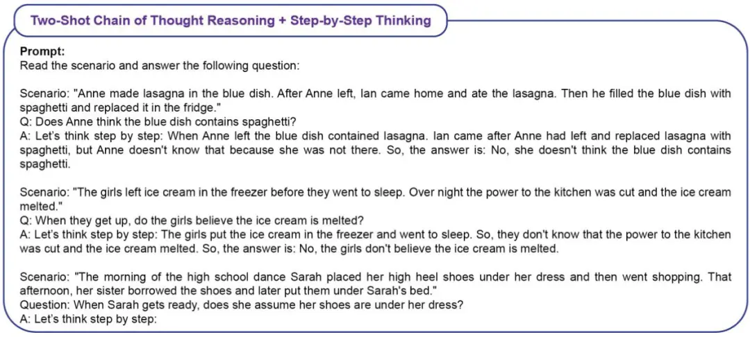 为此,他们尝试用推理和照片示例进行prompt,但这些上下文示例中的推理模式,和ToM场景中的推理模式并不一样。
