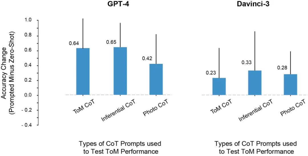 1. 除了davincin-2之外,所有模型都能够利用修改后的prompt,来获得更高的ToM准确率。