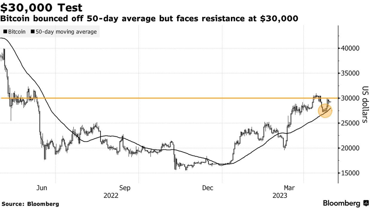 市场押注美联储最终将转向宽松的货币政策、以及美国银行业危机侵蚀了人们对法定货币的信心推动了比特币的上涨。不过,比特币如今在3万美元附近停滞不前,交易员则在等待进一步的催化剂。