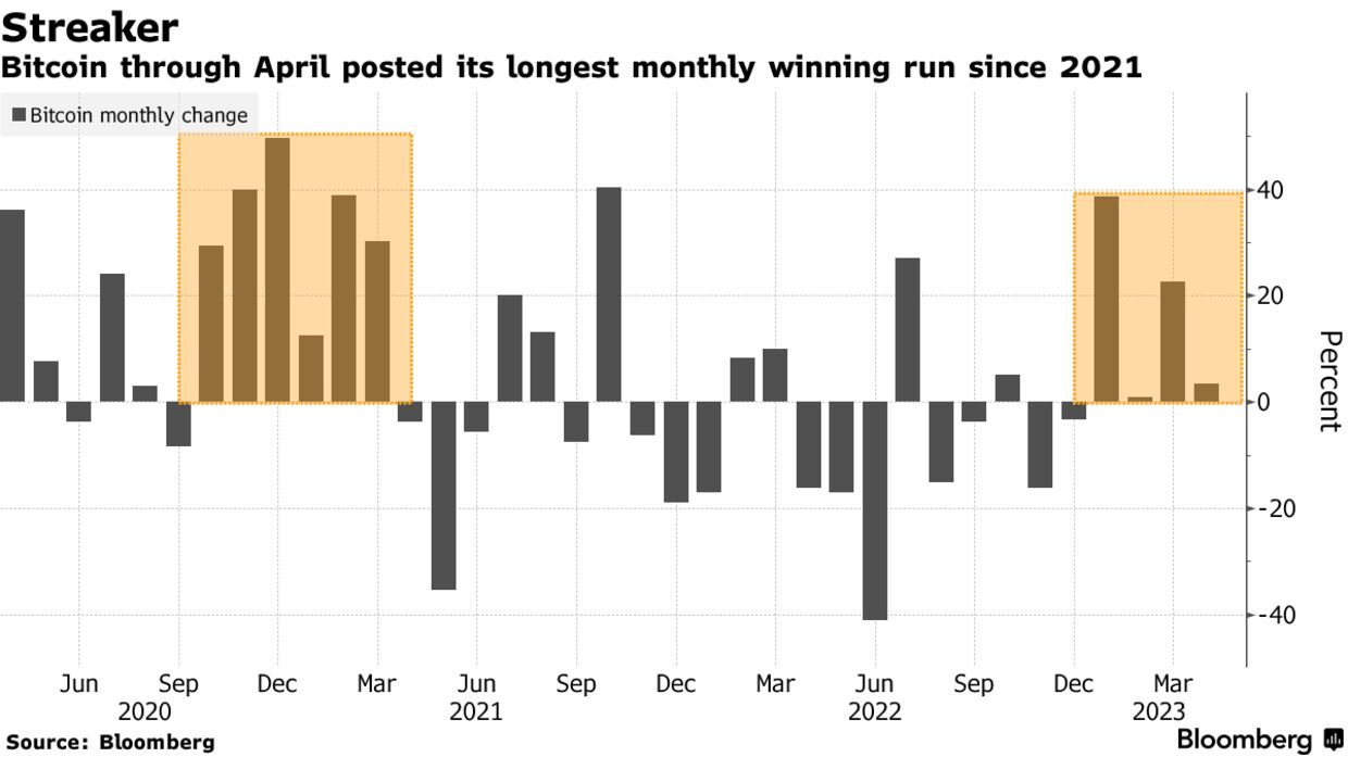 比特币在今年头四个月连续上涨,是自2021年3月以来连续上涨时间(按月度计算)最长的一次。值得注意的是,历史数据显示,在过去十年里,比特币连续四个月的上涨预示着接下来一年比特币平均上涨260%。