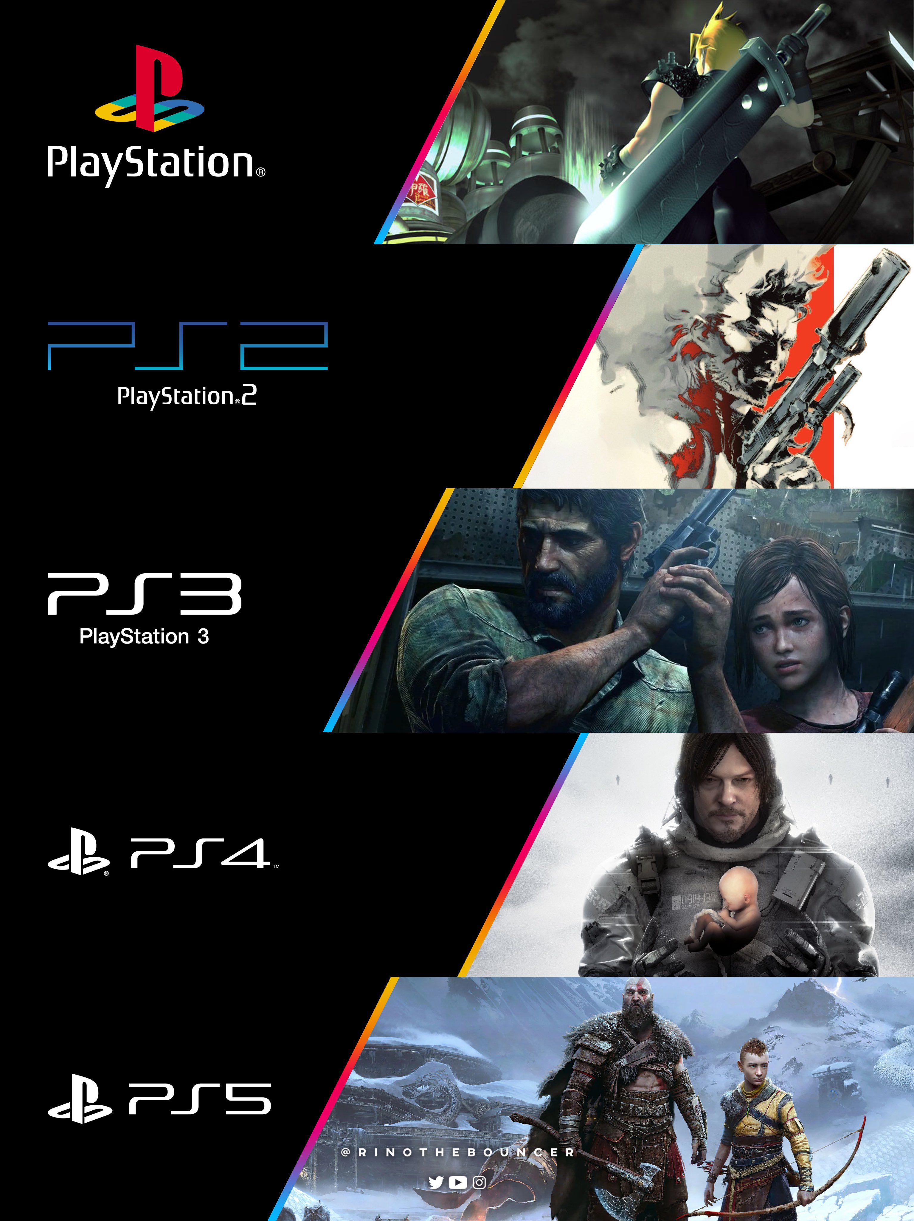 2022财年索尼收入达到了83亿美元,比去年(52亿)增加了30亿美元。索尼在2022财年出货了1910万台PS5主机,仅次于2016财年出货了2000万台PS4。索尼PlayStation主机的高销量主要是由高品质的独占游戏驱动。近日推主RinoTheBouncer整理了定义五个PlayStation世代的电子游戏,它们是: