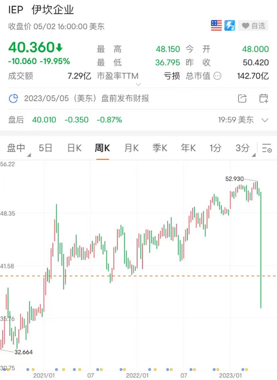报告一出,伊坎旗下控股公司伊坎企业(Icahn Enterprises LP,IEP)股价美东时间5月2日周二收盘暴跌19.95%,创有史以来最大单日跌幅,市值蒸发40多亿美元。