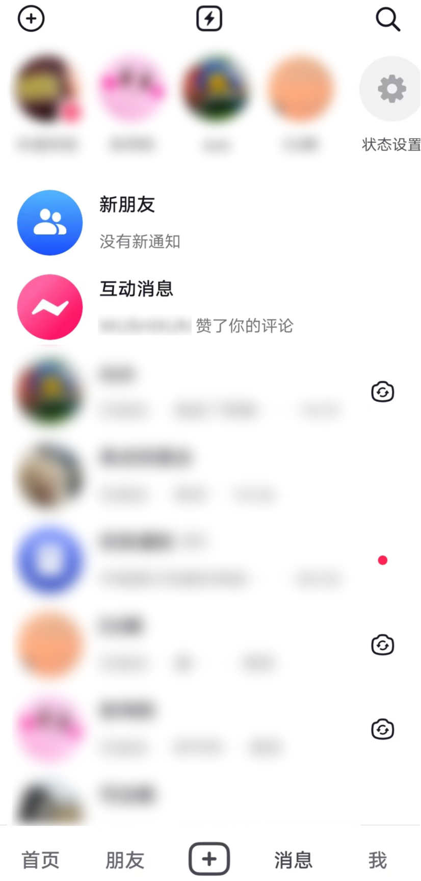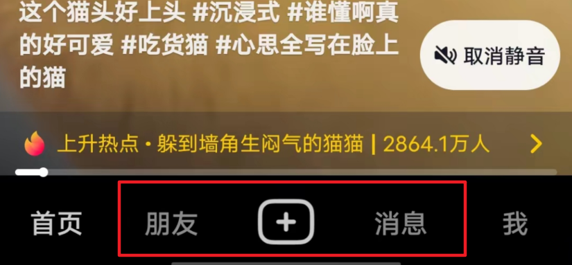 抖音首页的四个一级入口,其中有两个都是社交属性的。一个是聊天入口,一个是好友圈入口。