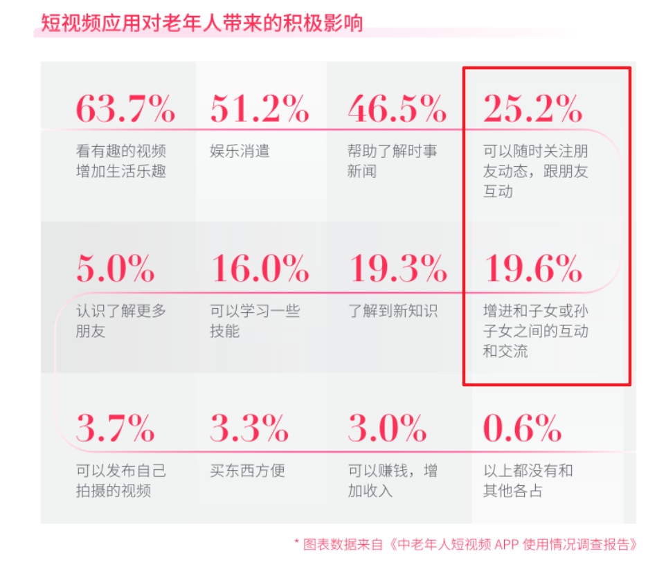 根据 2021 年《中老年短视频使用情况调查报告 》来看,玩短视频的老年人里,有 25.2% 的人是互动交友的,有 19.6% 是跟子女们交流。