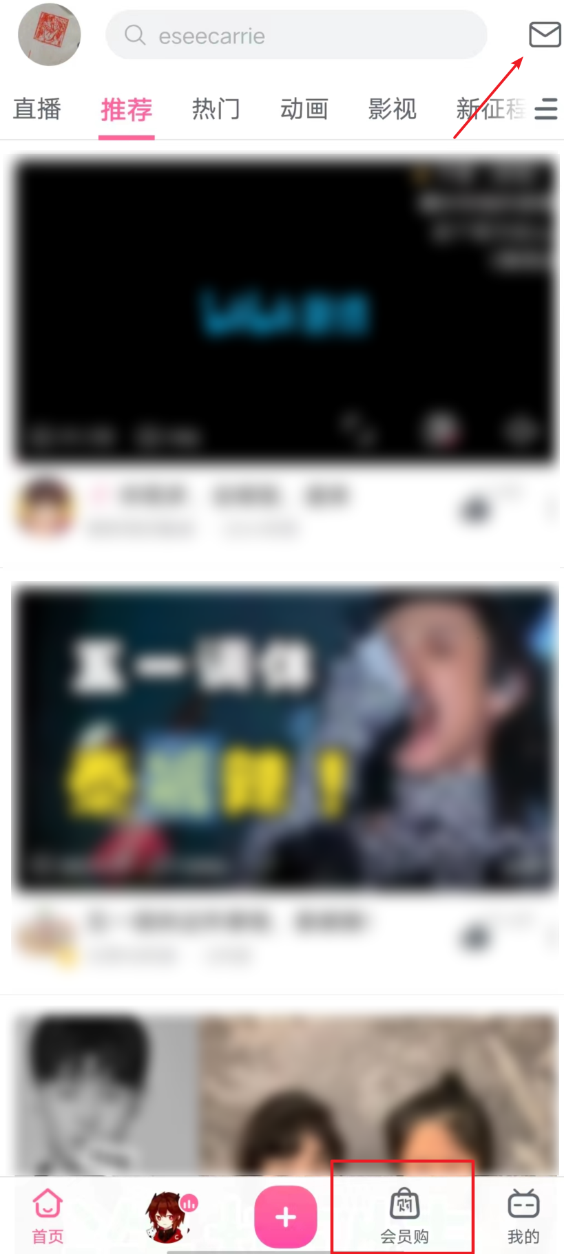 在抖音放聊天消息的栏位上, B 站放的是自己的会员购。