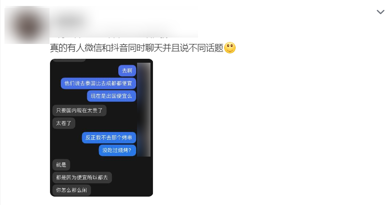 很多年轻人一边在微信上聊天,一边在抖音上讨论,两头双开。