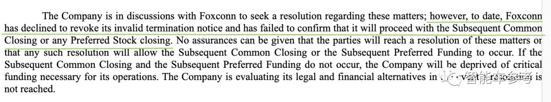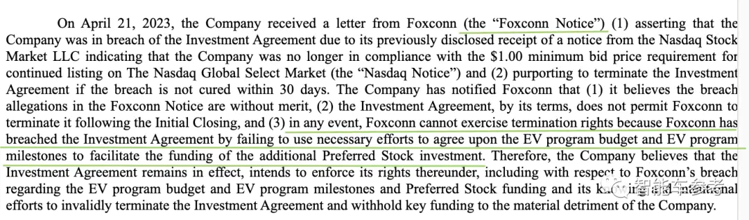 富士康表示,如果Lordstown在30个交易日内不能纠正该违约行为,富士康将终止投资协议。