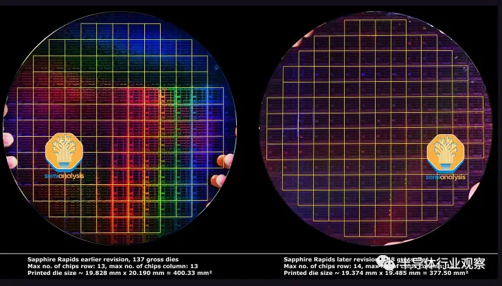 英特尔展示了两个版本的 SPR 的晶圆。较早的修订版每个晶圆有 137 个裸片,而最终版本有 148 个。这需要一直回到芯片的平面规划和物理设计。一个主要的好处是,它通过在每个晶圆上多制造 8% 的裸片,改善了 Sapphire Rapids 的成本结构。
