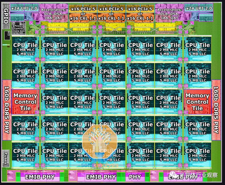 以下是 EMR-XCC 的平面布置图。在两个die中,66 核加上 I/O 部分在 7x14 网状互连网络上捆绑在一起。