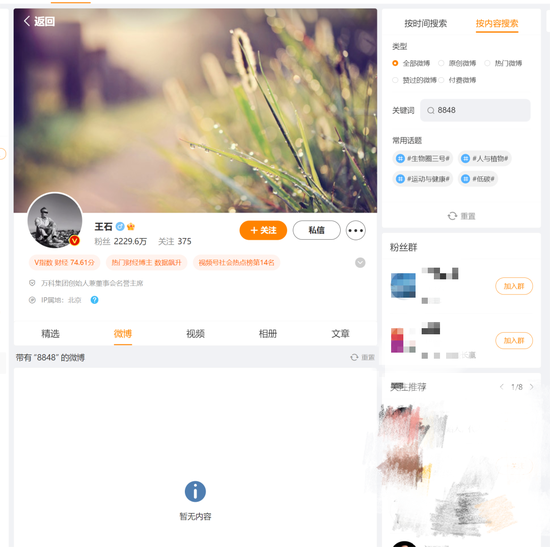 但很显然,目前来看,8848钛金手机已经止步。而在其提到的一路走来的代言人王石的个人微博,燃次元输入“8848钛金手机”,显示的信息已经为“暂无内容”。