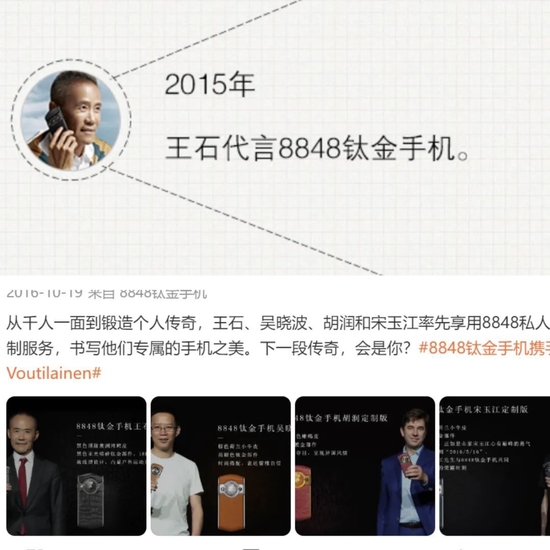 事实上,除了王石,包括财经作家吴晓波、胡润百富董事长胡润,以及资深登山者宋玉江都曾在2016年为8848钛金手机背书。但很显然,为了在最短时间,把“8848钛金手机”这一定位高端手机的产品推出去,8848钛金手机团队做的还不止这些。