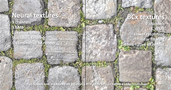 使用RTX 4090压缩9个通道、4K分辨率的纹理,BC算法体积3.33MB,NTC算法稍大一些为3.6MB,而渲染时间只是从0.49ms增加到1.15ms。