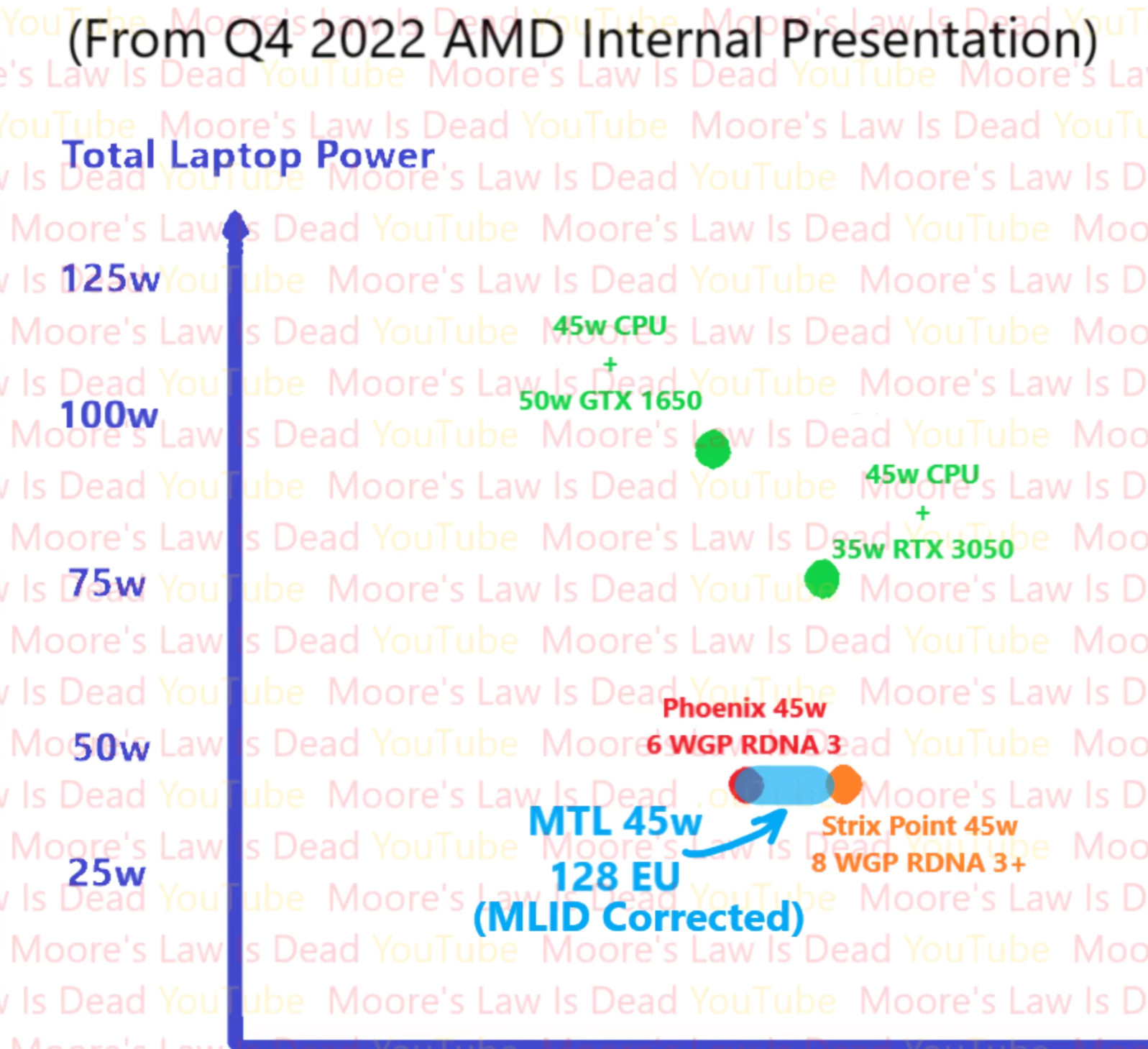 幻灯片显示,PhoenixAPU上的AMD Radeon 780M GPU具有12个RDNA 3计算单元,功率为45W,性能优于GTX 1650(50W)。这里还显示了Strix Point APU(RDNA 3+ GPU),配置了16个计算单元,功率为45W,性能超过了RTX 3050(35W)。