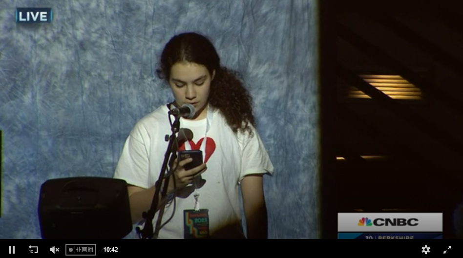 这三位中学生中,最先幸运被抽中现场提问的是一位第六次参加伯克希尔股东会的13岁女孩。