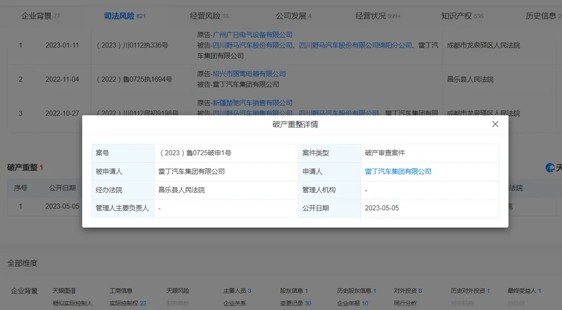 天眼查显示,5月5日,雷丁汽车新增一条破产重整案件信息,申请人和被申请人均为雷丁汽车集团有限公司,经办法院为昌乐县人民法院。2022年11月,多家媒体爆料称,雷丁汽车收到全款后不发车,登记的30余家经销商累计被欠款超2000万元,疑似该品牌即将破产。