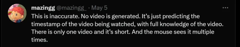 “这个说法是不准确的,并没有视频被生成。它只是在充分了解视频的情况下,预测了正在观看的视频的时间戳。”