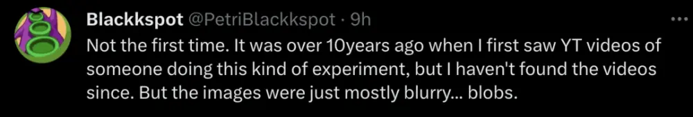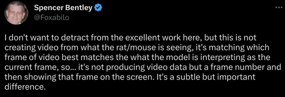 “我并非想贬低这项出色的工作,但这不是从老鼠看到的东西中创造视频,而是匹配哪一帧视频最符合模型解释当前帧的内容,所以......它不是产生视频数据,而是一个帧号,然后在屏幕上显示该帧。这个区别很微妙,但很重要。”