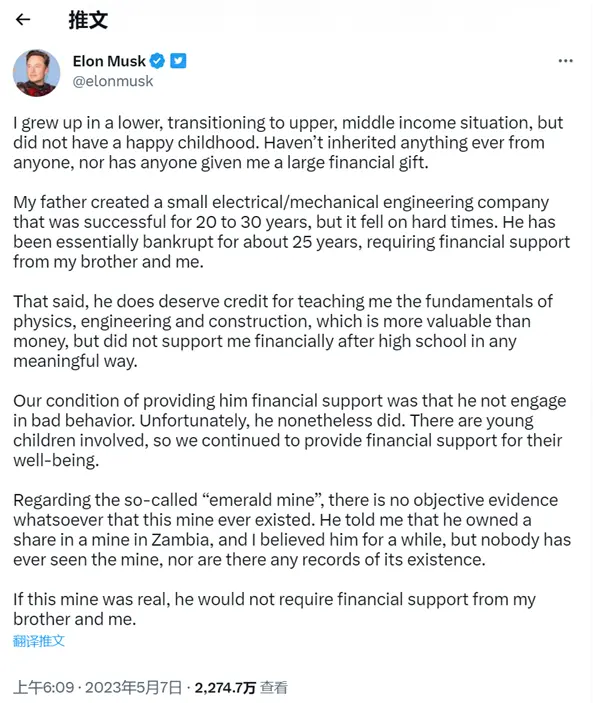 这个帖子获得了马斯克的认同,他发长文给出了更详细的说明,称自己成长在一个低收入家庭,虽然家里也向中高收入过渡,但他的童年并不幸福,没有从任何人那里继承过任何东西,也没有人给他送过大额的金钱礼物。