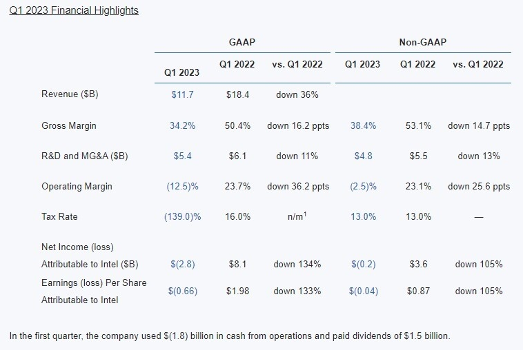 2023年第一季度,Intel总收入117亿美元,同比下降36%,毛利率34.2%,同比下降16.2个百分点,净亏损28亿美元,创造历史之最,而去年同期为净利润81亿美元。
