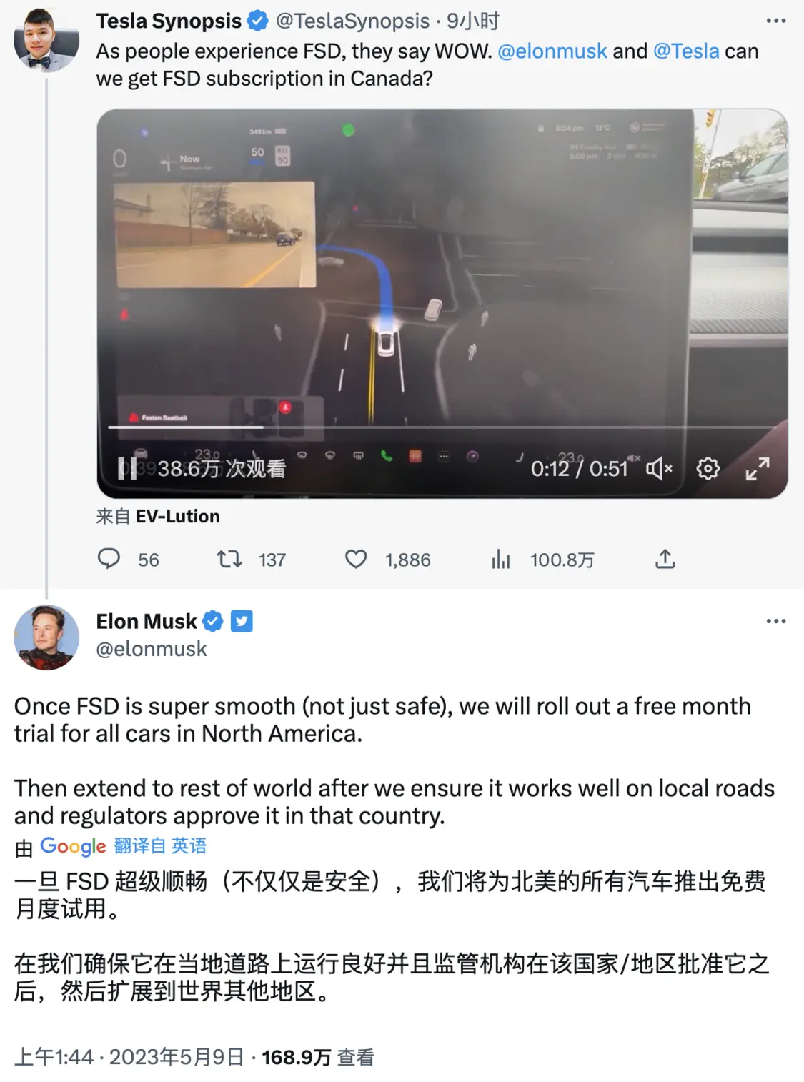 “一旦FSD变得超级顺畅(不仅仅是安全),我们将在北美推出一个月的免费试用。然后,在我们确保它在当地道路上运行良好,并在该国获得监管机构批准后,再把它扩展到世界其他地区。