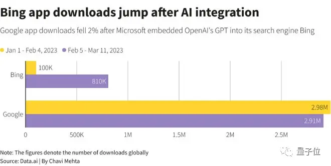 更显著的影响出现在移动端。根据data.ai统计,必应APP下载量猛增8倍,而GoogleAPP下载量下降2%。