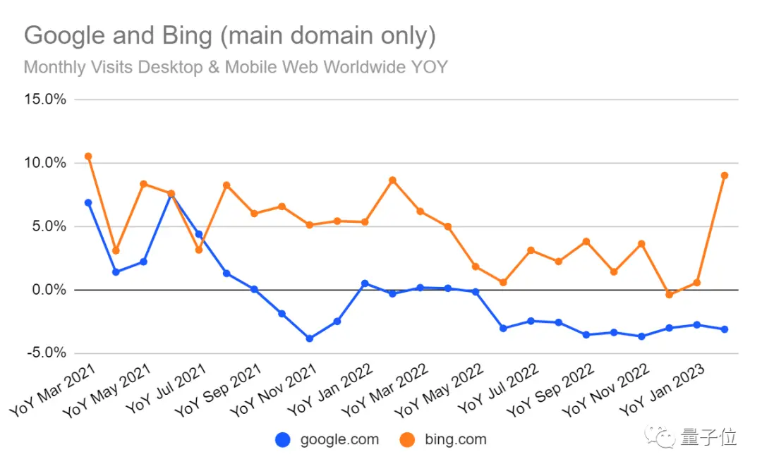 今年2月,必应宣布集成ChatGPT能力后,访问量增涨9%,与此同时Google下降了3.1%。