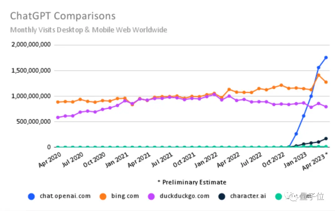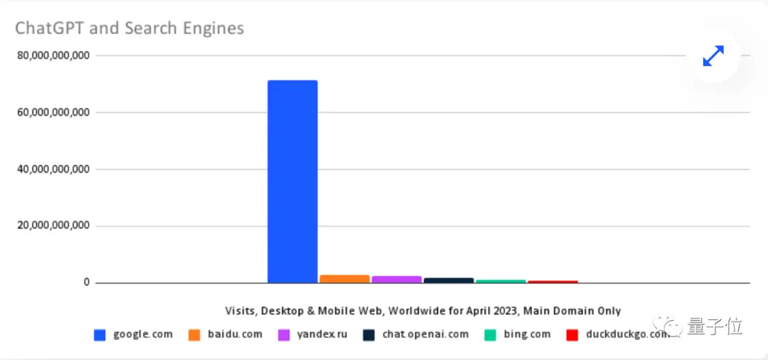 ChatGPT上月全球访问量 17.6 亿次,已达到Google的2%!根据SimilarWeb统计,已超越必应、鸭鸭走DuckDuckGo等其他国际搜索引擎。挡在前面的除了Google,就只剩中国的百度和俄罗斯的Yandex了。