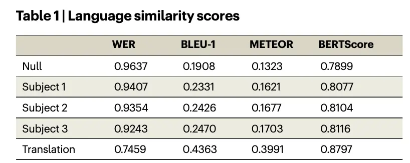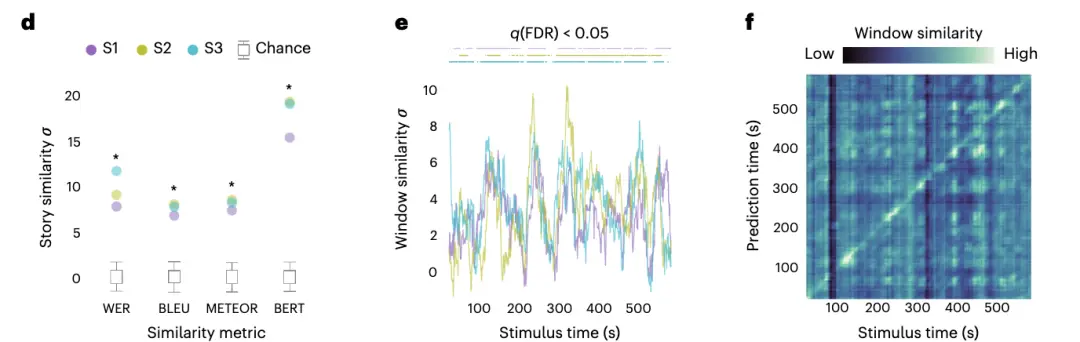 通过这种方法,在一系列语言相似性指标下,语义解码器对测试故事的预测与实际刺激词的相似度明显高于预期。准确率也高达 82%。