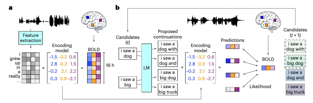 具体来看,为了收集大脑活动数据,研究人员让研究对象在 fMRI 扫描仪内听一些音频故事。与此同时,通过 fMRI 扫描仪观察他们的大脑在听这些话时反应情况。如图 a 所示,3 名受试者在听 16 小时的叙述性的故事时,AI 系统记录了 MRI(磁共振成像)的反应。