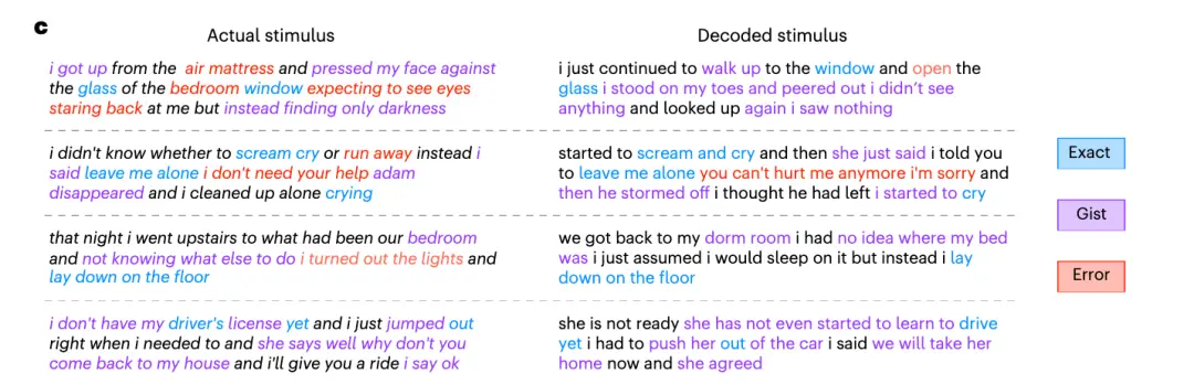 不过,语义解码器主要捕捉了参与者想法中的要点,并不是一字一句的完整思想内容。如参与者听到的是,“我从气垫上站起来,把脸贴在卧室窗户的玻璃上,希望看到有一双眼睛盯着我,但却发现只有一片黑暗。”
