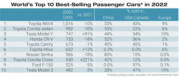 从机构的数据来看,去年在全球销量高于特斯拉Model Y的两款汽车,均来自丰田,分别是RAV4荣放和卡罗拉sedan,前者销售101.6万辆,是去年销量唯一过百万的车型,后者销售99.2万辆,两款车的销量同比均下滑了10%。