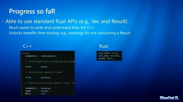 按照微软此前介绍,Rust语言的优势在于极高的内存安全性,原来内核中大量的不安全的子例程在改写后消失不见。
