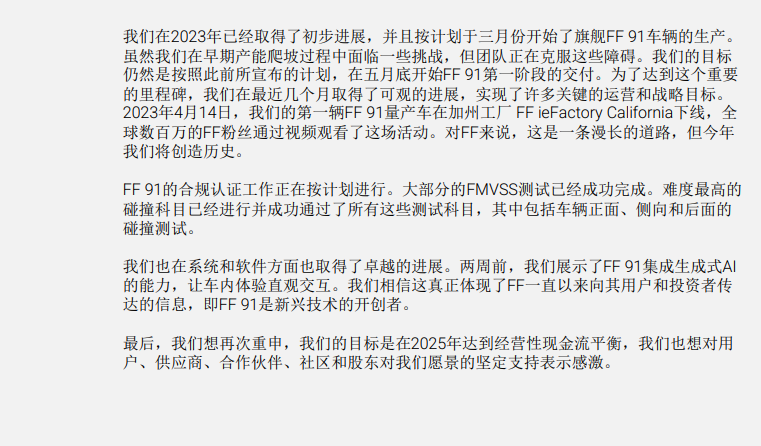 FF重申,FF的目标是在2025年达到经营性现金流收支平衡。