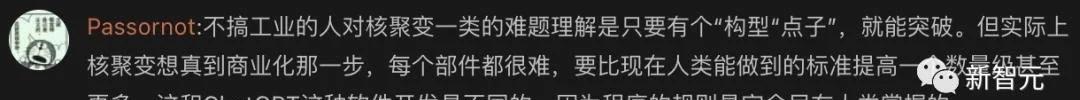 不搞工业的人对核聚变一类的难题理解是只要有个“构型”“点子”,就能突破。但实际上核聚变想真到商业化那一步,每个部件都很难,要比现在人类能做到的标准提高一个数量级甚至更多。这和ChatGPT这种软件开发是不同的,因为程序的规则是完全尽在人类掌握的。