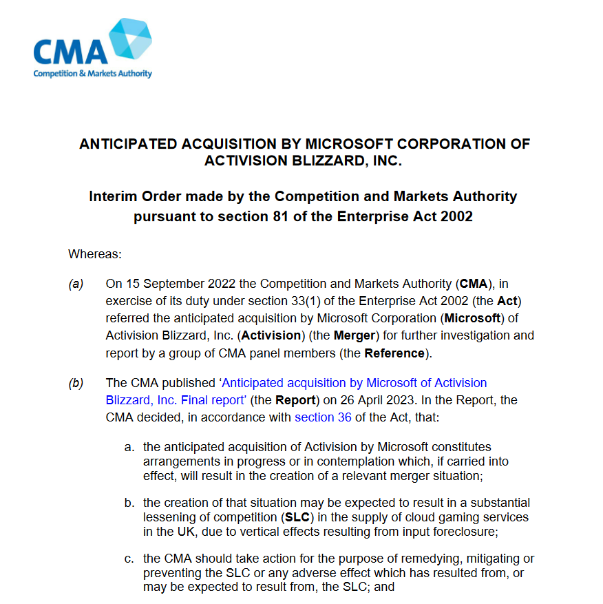 虽然 CMA 是唯一正式阻止该交易的机构,但美国联邦贸易委员会(FTC)早在 12 月就提出了法律申诉,并将于 8 月举行法庭听证会。欧盟委员会(UC)在 1 月份就发出了正式的反垄断警告,并将在 5 月22 日之前做出最终决定。