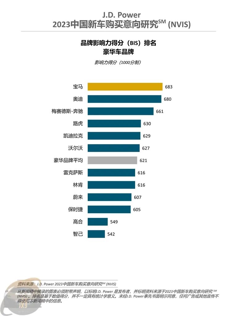 豪华车品牌中,宝马、奥迪和奔驰依旧夺得了前三名,而雷克萨斯、林肯、保时捷等均低于平均水平。
