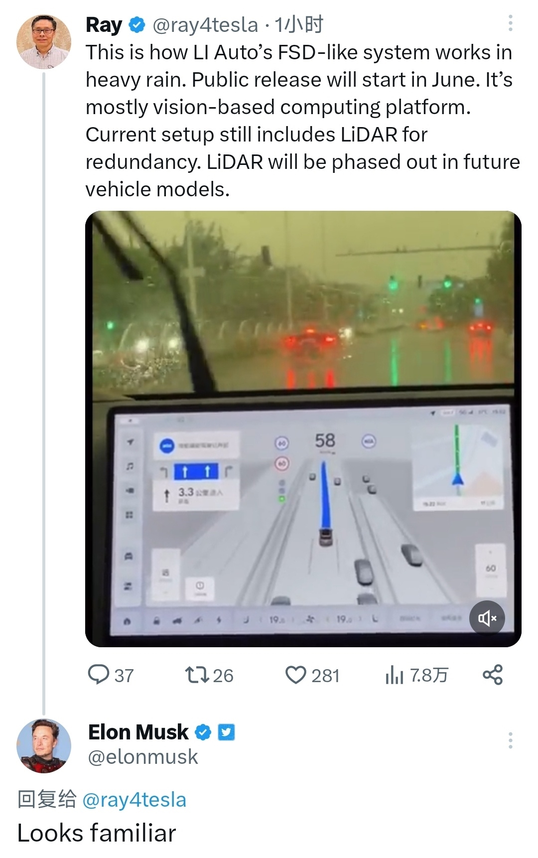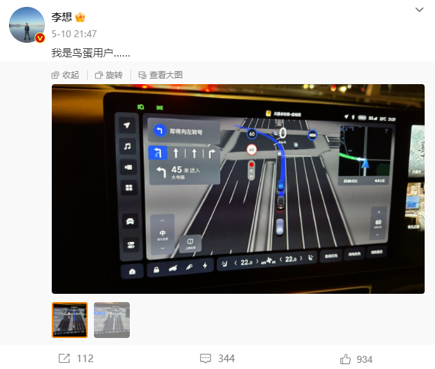 在理想近日举办的第一季度财报电话会议上,官方透露了有关城市NOA推送的计划,其表示,将于6月份推送早鸟测试,有部分用户获得推送。近日,理想COE李想和产品经理纷纷晒出了自己体验NOA功能的画面,并调侃称自己为“鸟蛋用户”,有网友将相关内容发布到推特上并引起了马斯克的注意,马斯克在点评时称“看起来有点眼熟”。
