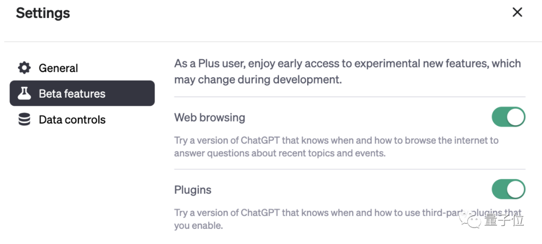 好消息,ChatGPT的联网和插件功能不用等了!OpenAI刚刚宣布,ChatGPT Plus用户,下周开始不用排队,直接就能用上这些新功能。具体来说,在最新的联网和插件Beta版中,ChatGPT会在设置里增加这样一个界面: