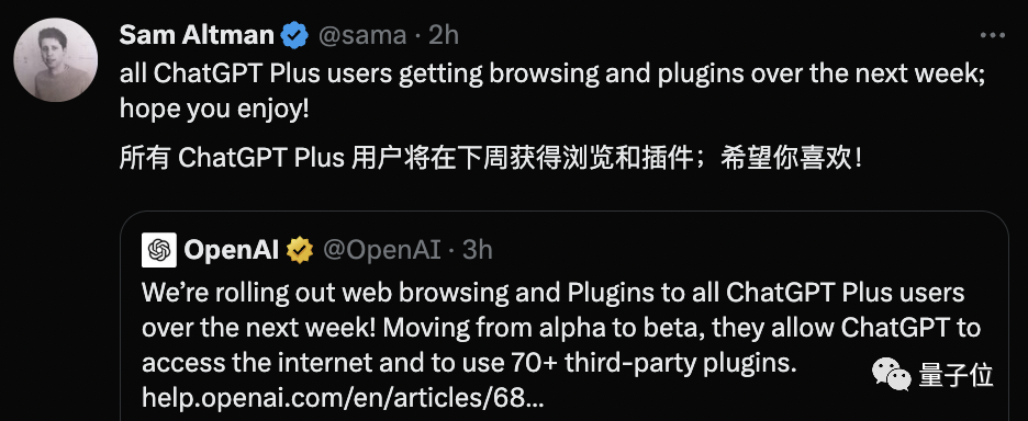 回顾一下,网页浏览功能,能让ChatGPT不再局限于回答2021年9月之前的信息,能直接联网查询最新消息。