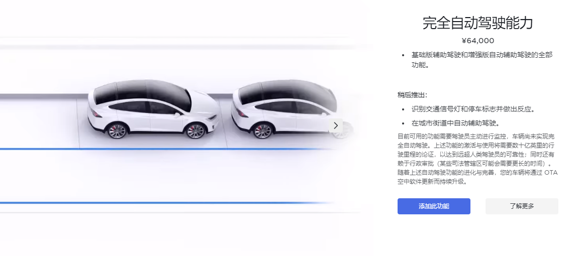 特斯拉FSD,在官网名称为“完全自动驾驶能力”,国内售价6.4万元,包含基础版辅助驾驶和增强版自动辅助驾驶的全部功能。