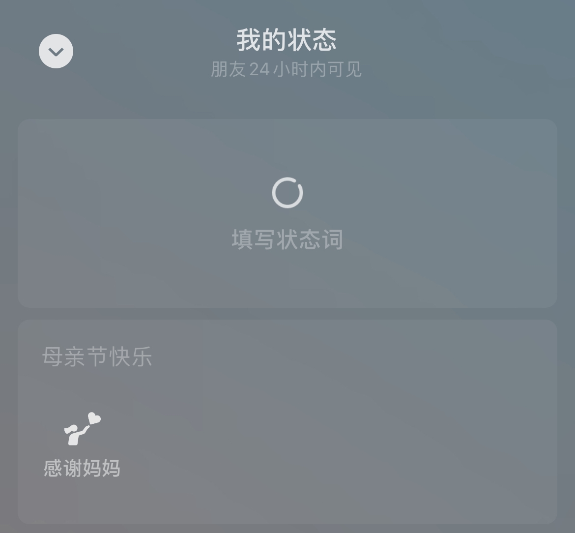 与其他普通常驻状态一样,母亲节状态设置后为24小时可见,由于是节日限定,因此该状态也只有今天一天时间来设置,各位可在微信“我”的界面点击“状态”选择。