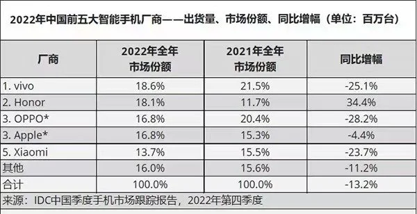 2022年中国前五大智能手机厂商出货量数据