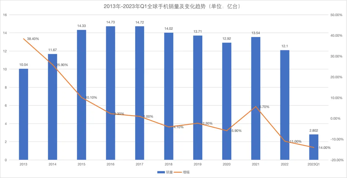 2013-2023Q1 全球手机销量及变化趋势,数据来源IDC、Counterpoint Research、TechInsights