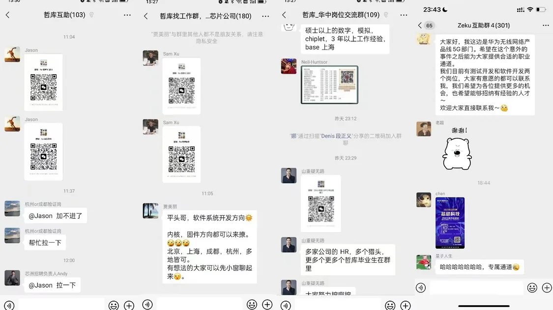 5月12日 11:30后,半导体行业猎头迅速行动,为了争夺哲库离职员工,猎头拉群的二维码在朋友圈迅速流传。